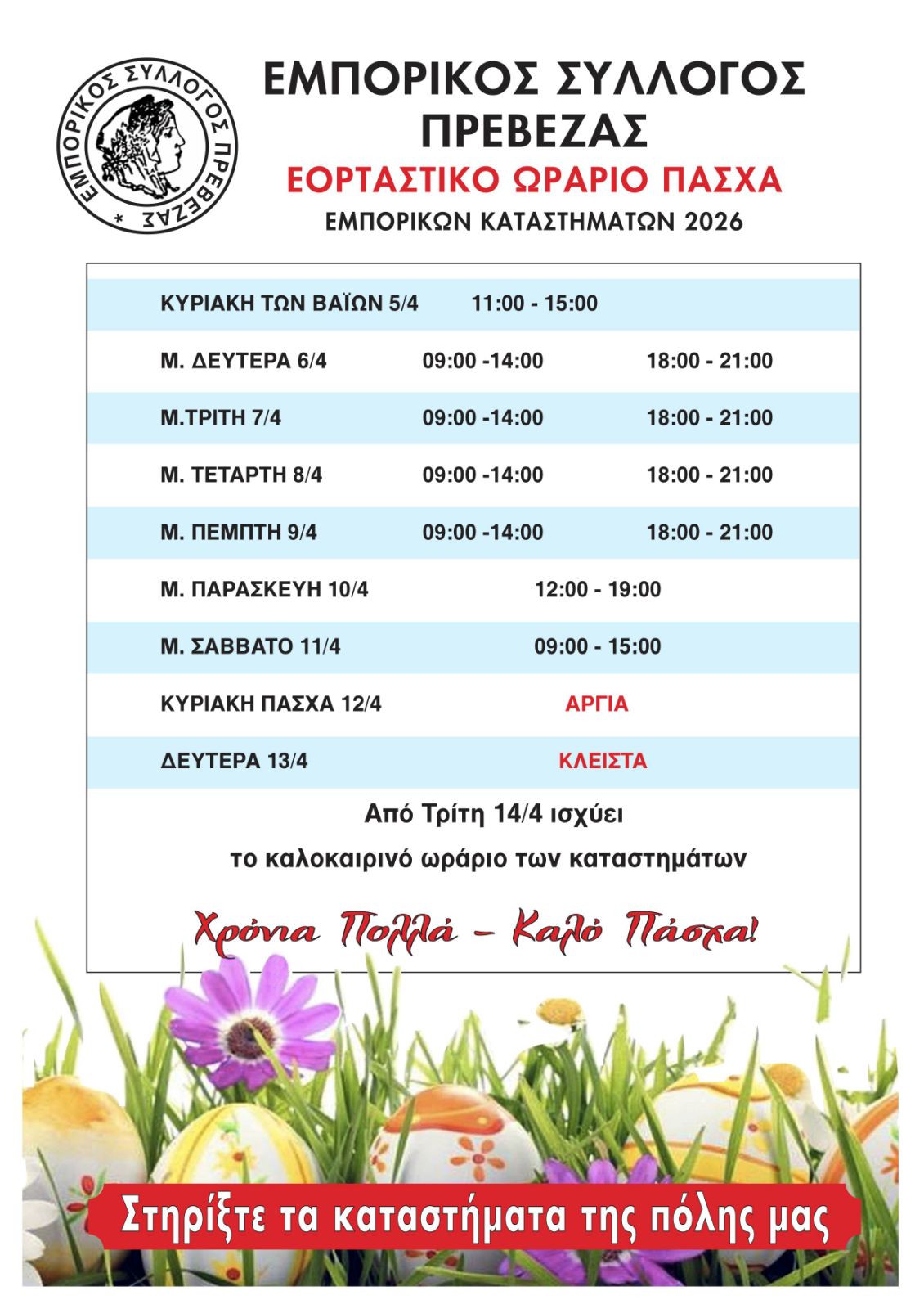 Το εορταστικό ωράριο των εμπορικών καταστημάτων για το Πάσχα 2026 στην Πρέβεζα όπως ανακοινώθηκε από τον Εμπορικό Σύλλογο Πρέβεζας.