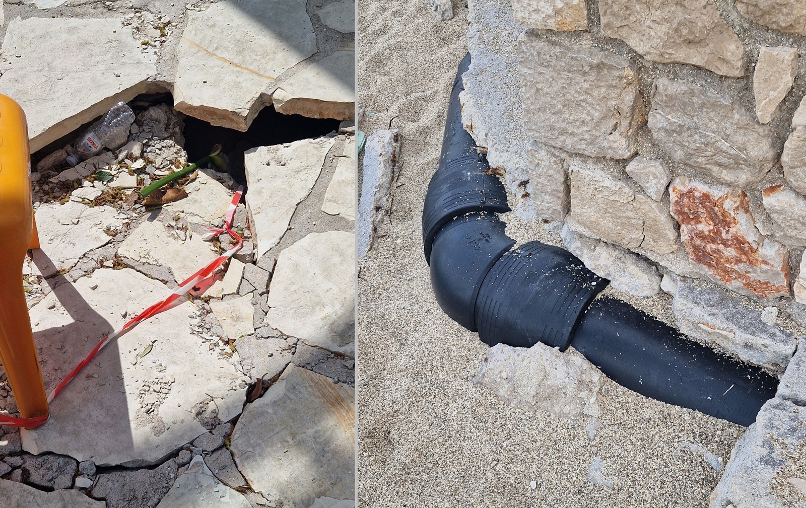 – Βόρειο τμήμα πεζόδρομου: Η εικόνα έχει επιδεινωθεί δραματικά, με εμφανείς καταστροφές και ήδη δημιουργημένη επικίνδυνη τρύπα στο οδόστρωμα, στο κέντρο του οικισμού.