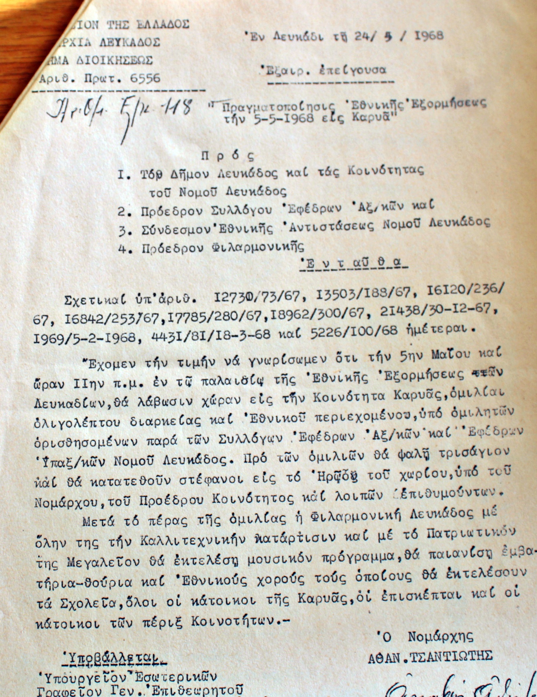 Έγγραφο της Νομαρχίας Λευκάδας με ημερομηνία 24 Απριλίου 1968 και την ένδειξη «εξαιρετικώς επείγον» φωτίζει τον τρόπο με τον οποίο οργανώνονταν οι λεγόμενες «εθνικές εξορμήσεις» στα χρόνια της δικτατορίας. Η διαταγή αφορά την πραγματοποίηση «Εθνικής Εξορμήσεως» στην Καρυά Λευκάδας, στις 5 Μαΐου 1968, και απευθύνεται στον Δήμο και τις Κοινότητες του Νομού, τους συλλόγους εφέδρων αξιωματικών, τον Σύνδεσμο «Εθνικής Αντιστάσεως» και την Φιλαρμονική.