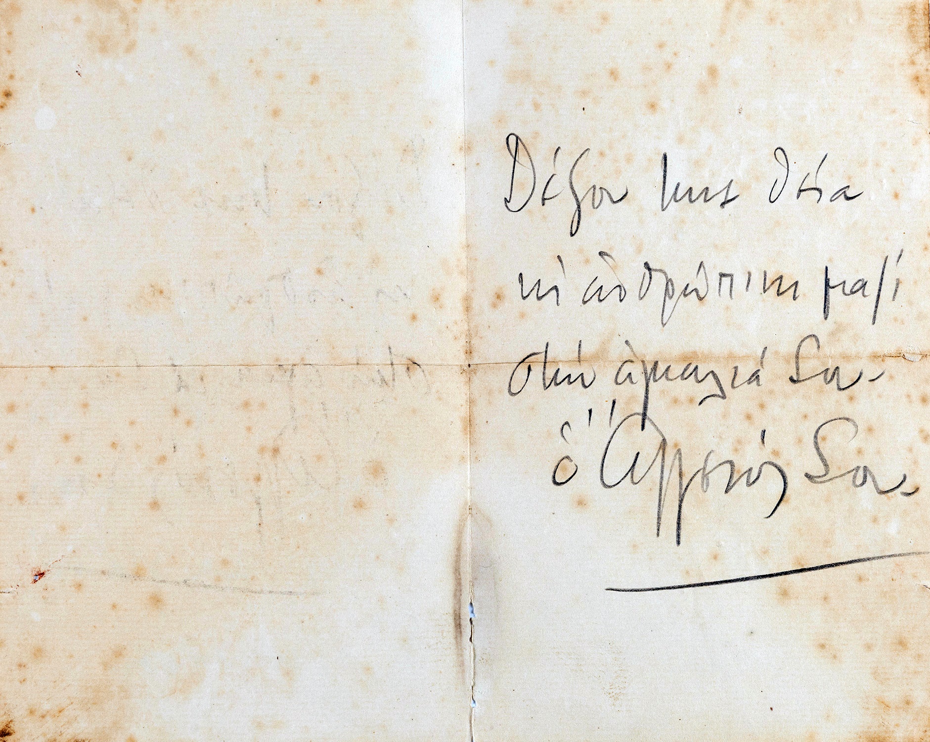 Αὐτόγραφο σημείωμα μέ τήν ὑπογραφή του («ὁ Ἄγγελός Σου») πρός ἕνα μή κατονομαζόμενο πρόσωπο («Ζωή μου»).
