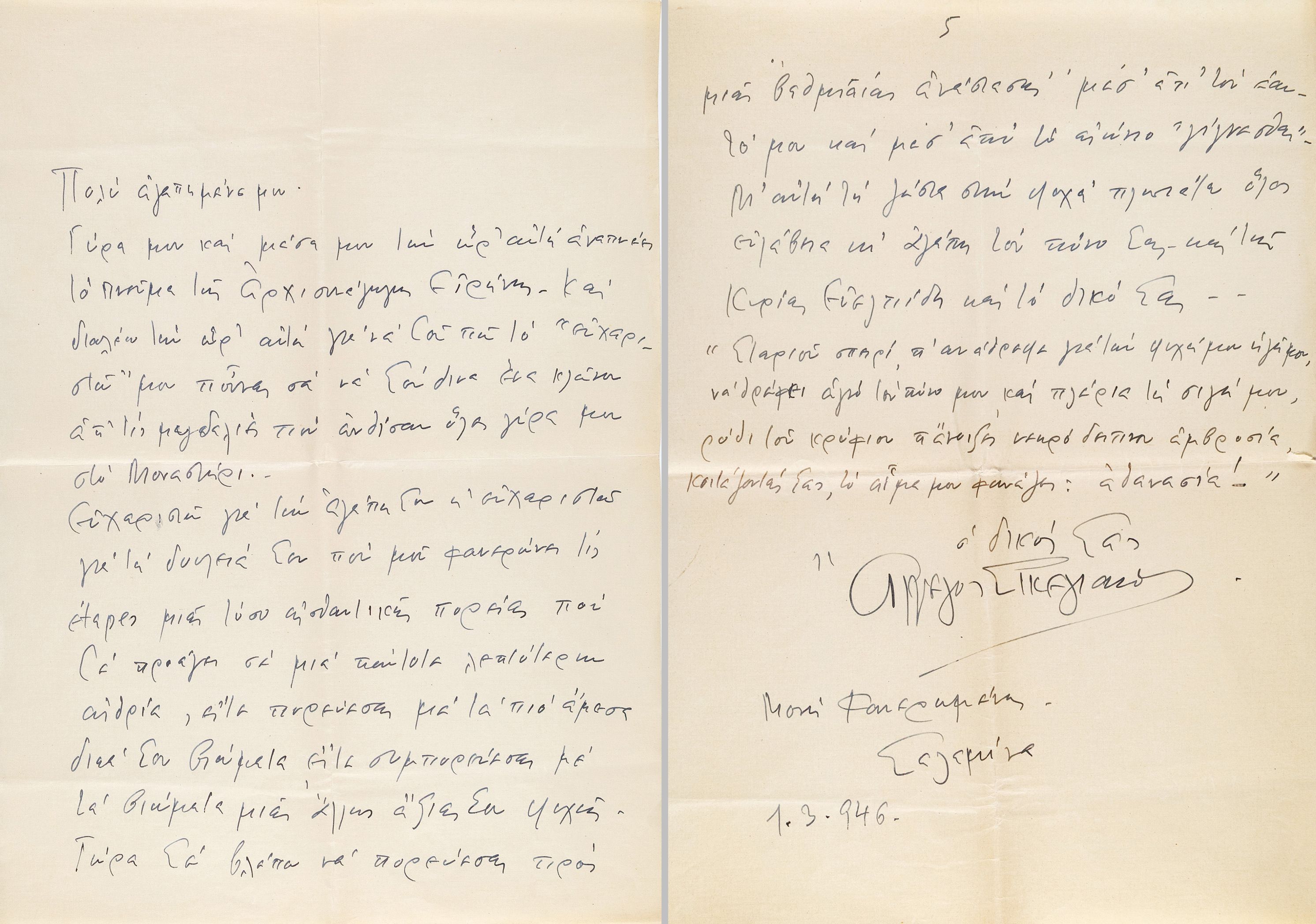 Γραμμένη σε 5 λυτά φύλλα αριθμημένα [1]-5 (οι πίσω όψεις λευκές), 350 x 250 mm. Αυτόγραφη φυλλαρίθμηση. • «… Ἡ Ἄννα μοῦ εἴπε χτές πώς ἐπανέλαβε κάποια λόγια μου στήν Κυρία Εὐελπίδη, πού εἶπα τήν ἡμέρα τῆς ταφῆς τοῦ Παλαμᾶ καί πώς τά λόγια αὐτά τή γλύκαναν… Εἶπα τότε (θά θυμάστε βέβαια πόσο ἤτανε γλυκιά ἡ μέρα ἐκείνη) πώς «τέτοια μέρα εἴτε ἀπάνου εἴτε ἀπό κάτου ἀπό τή γής εἶναι κανένας, εἶναι πάντα ὡραία». Καί σήμερα πού Σᾶς γράφω νιώθω, μέσα κι ἀπό τή δική μου τή φθορά, τό γλυκό ζεστό κύμα μιᾶς βαθμιαίας ἀνάστασης μέσ’ ἀπ’ τόν ἑαυτό μου καί μέσ’ ἀπό τό αἰώνιο «γίγνεσθαι». Μ’ αὐτή τή ζέστα στήν ψυχή πλησιάζω ὅλος εὐλάβεια κι ἀγάπη τόν πόνο Σας…». • Βλ. Ἄγγελου Σικελιανοῦ, Γράμματα, φιλολογική ἐπιμέλεια Κώστας Μπουρναζάκης, Αθήνα, Ίκαρος, 2000, τ. Β΄, σ. 434-6.