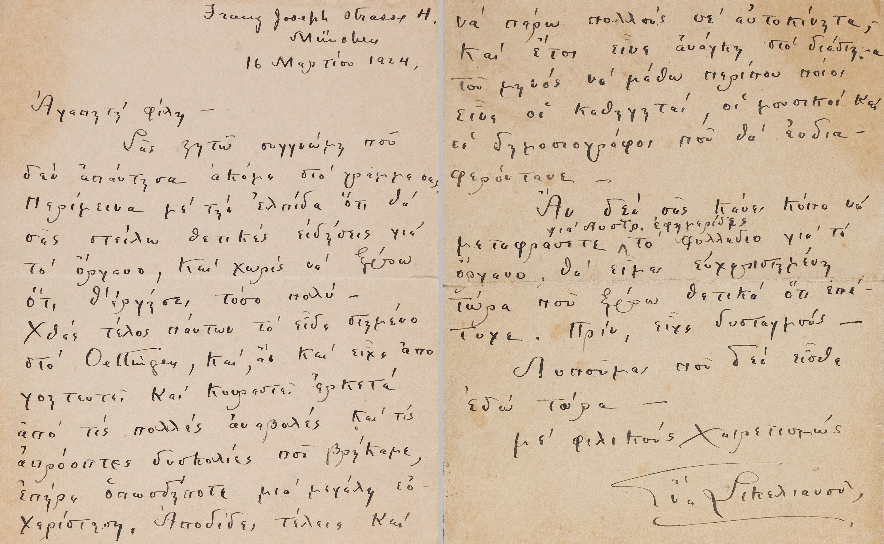 Γραμμένη σε δίφυλλο, 4 σελίδες, 201 x 165 mm. «…Χθές τέλος πάντων τό εἶδα στημένο στό Oettingen, καί, ἄν καί εἶχα ἀπογοητευτεῖ καί κουραστεῖ ἀρκετά ἀπό τίς πολλές ἀναβολές καί τίς ἀπρόοπτες δυσκολίες ποῦ βρήκαμε, ἐπήρα ὁπωσδήποτε μιά μεγάλη εὐχαρίστηση. Ἀποδίδει τέλεια καί ὡραῖα τούς ἑλληνικούς ἥχους, — Καί ἔτσι ὁ σκοπός μου συνεπληρώθη. Ὡς ὄργανο δέν ἔχει τήν τελειότητα τῶν νέων ὀργάνων γιατί ἡ δυσκολία τοῦ κουρδίσματος μᾶς ἐμπόδισε ἀπό τό νά προσθέσουμε, ὅπως ἤλπιζα, ξύλινους αὔλους [sic], […] ἀλλά θεωρῶ τόσο μεγάλο τό κατόρθωμα νά παίξει σωστά τήν ἑλληνική μουσική ποῦ σταματῶ ἐδώ εὐχαριστημένη, καί ἴσως ἄλλος ἀργότερα τό τελειοποιήσει …». • Πρόκειται για το «Evion Panharmonium», ένα εξειδικευμένο αρμόνιο επινοημένο από τον Κωνσταντίνο Ψάχο, ο οποίος το ονόμασε έτσι από το όνομα της Εύας Σικελιανού, καθώς εκείνη το χρηματοδότησε και επέβλεψε την κατασκευή του στη Γερμανία.