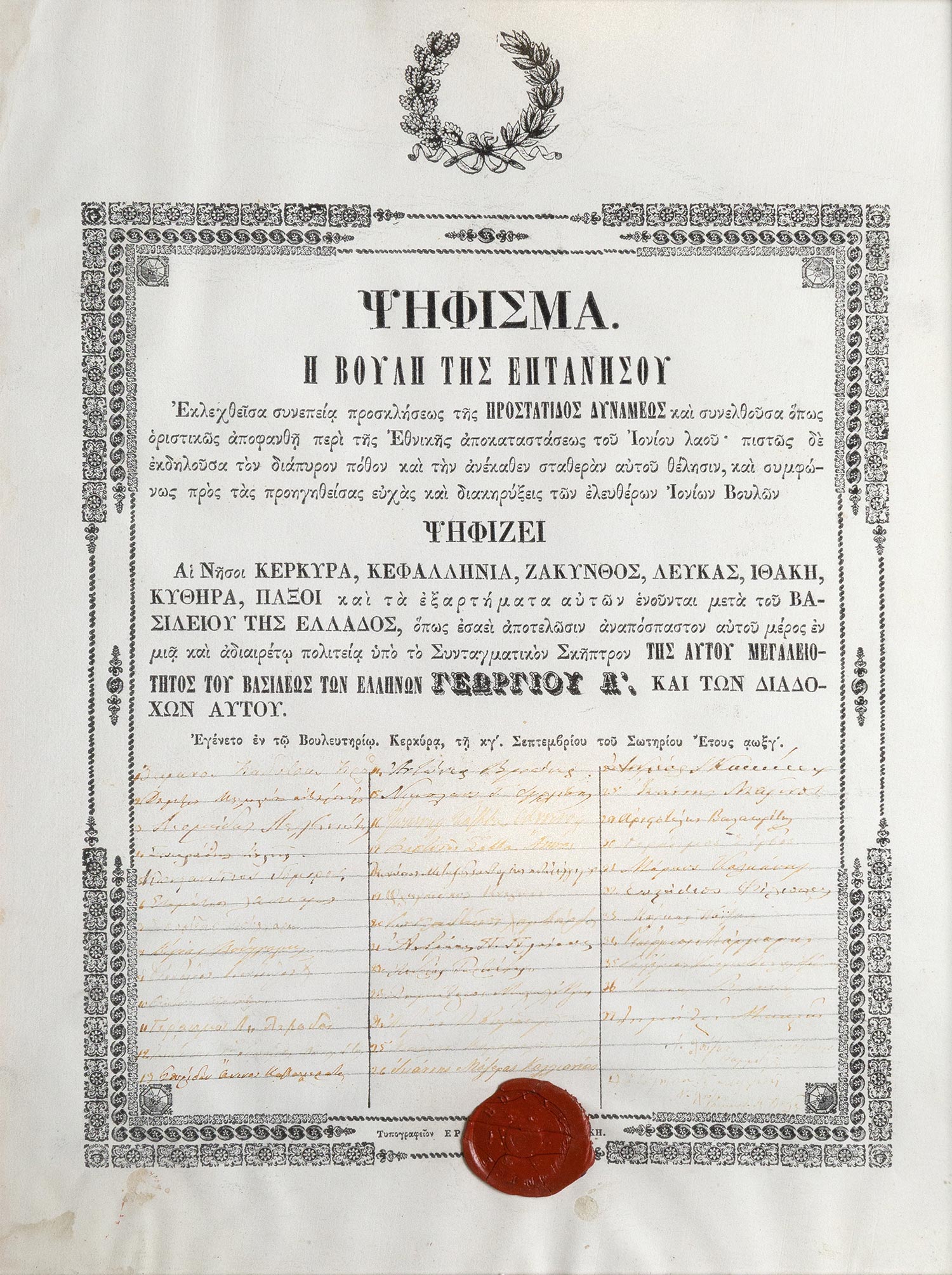 ΨΗΦΙΣΜΑ. Η ΒΟΥΛΗ ΤΗΣ ΕΠΤΑΝΗΣΟΥ Ἐκλεχθεῖσα συνεπεῖᾳ προσκλήσεως τῆς ΠΡΟΣΤΑΤΙΔΟΣ ΔΥΝΑΜΕΩΣ καί συνελθοῦσα ὅπως ὁριστικῶς ἀποφανθῇ περί τῆς Ἐθνικῆς ἀποκαταστάσεως τοῦ Ἰὀνίου λαοῦ· πιστῶς δέ ἐκδηλοῦσα τόν διάπυρον πόθον καί τήν ἀνέκαθεν σταθεράν αὐτοῦ θέλησιν, καί συμφώνως πρός άς προηγηθείσας εὐχάς καό διακηρύξεις τῶν ἐλευθέρων Ἰὀνίων Βουλῶν ΨΗΦΙΖΕΙ Αἱ Νῆσοι ΚΕΡΚΥΡΑ, ΚΕΦΑΛΛΗΝΙΑ, ΖΑΚΥΝΘΟΣ, ΛΕΥΚΑΣ, ΙΘΑΚΗ, ΚΥΘΗΡΑ, ΠΑΞΟΙ καί τά ἐξαρτήματα αὐτῶν ἑνοῦνται μετά τοῦ ΒΑΣΙΛΕΙΟΥ ΤΗΣ ΕΛΛΑΔΟΣ, ὅπως ἐσαεί ἀποτελῶσιν ἀναπόσπαστον αὐτοῦ μέρος ἐν μία καί ἀδιαιρέτῳ πολιτείᾳ ὑπό τό Συνταγματικόν Σκῆπτρον ΤΗΣ ΑΥΤΟΥ ΜΕΓΑΛΕΙΟΤΗΤΟΣ ΤΟΥ ΒΑΣΙΛΕΩΣ ΤΩΝ ΕΛΛΗΝΩΝ ΓΕΩΡΓΙΟΥ Α΄ ΚΑΙ ΤΩΝ ΔΙΑΔΟΧΩΝ ΑΥΤΟΥ. Ἐγένετο ἐν τῷ Βουλευτηρίῳ. Κερκύρᾳ, τῇ κγ΄ Σεπτεμβρίου τοῦ Σωτηρίου Ἔτους ἀωξγ΄. [κάτω:] Τυπογραφεῖον ΕΡΜΗΣ ΑΝΤΩΝΙΟΥ ΤΕΡΖΑΚΗ.