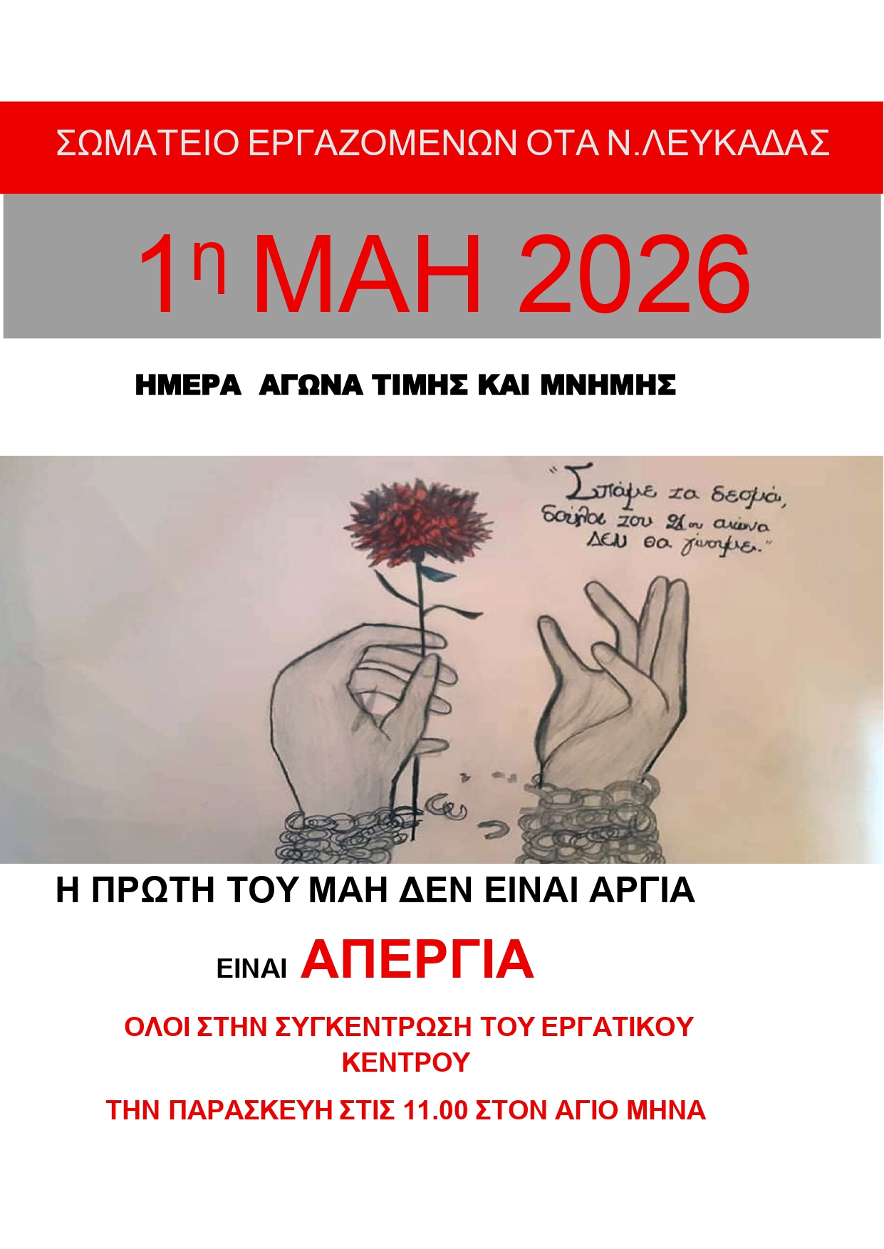ΟΛΟΙ ΣΤΗΝ ΑΠΕΡΓΙΑΚΗ ΣΥΓΚΕΝΤΡΩΣΗ ΤΗΣ ΠΡΩΤΟΜΑΓΙΑΣ ΠΟΥ ΔΙΟΡΓΑΝΩΝΕΙ ΤΟ ΕΡΓΑΤΙΚΟ ΚΕΝΤΡΟ ΤΗΝ ΠΑΡΑΣΚΕΥΗ 1 η ΜΑΗ ΣΤΙΣ 11:00 ΠΜ ΣΤΟΝ ΑΗ ΜΗΝΑ