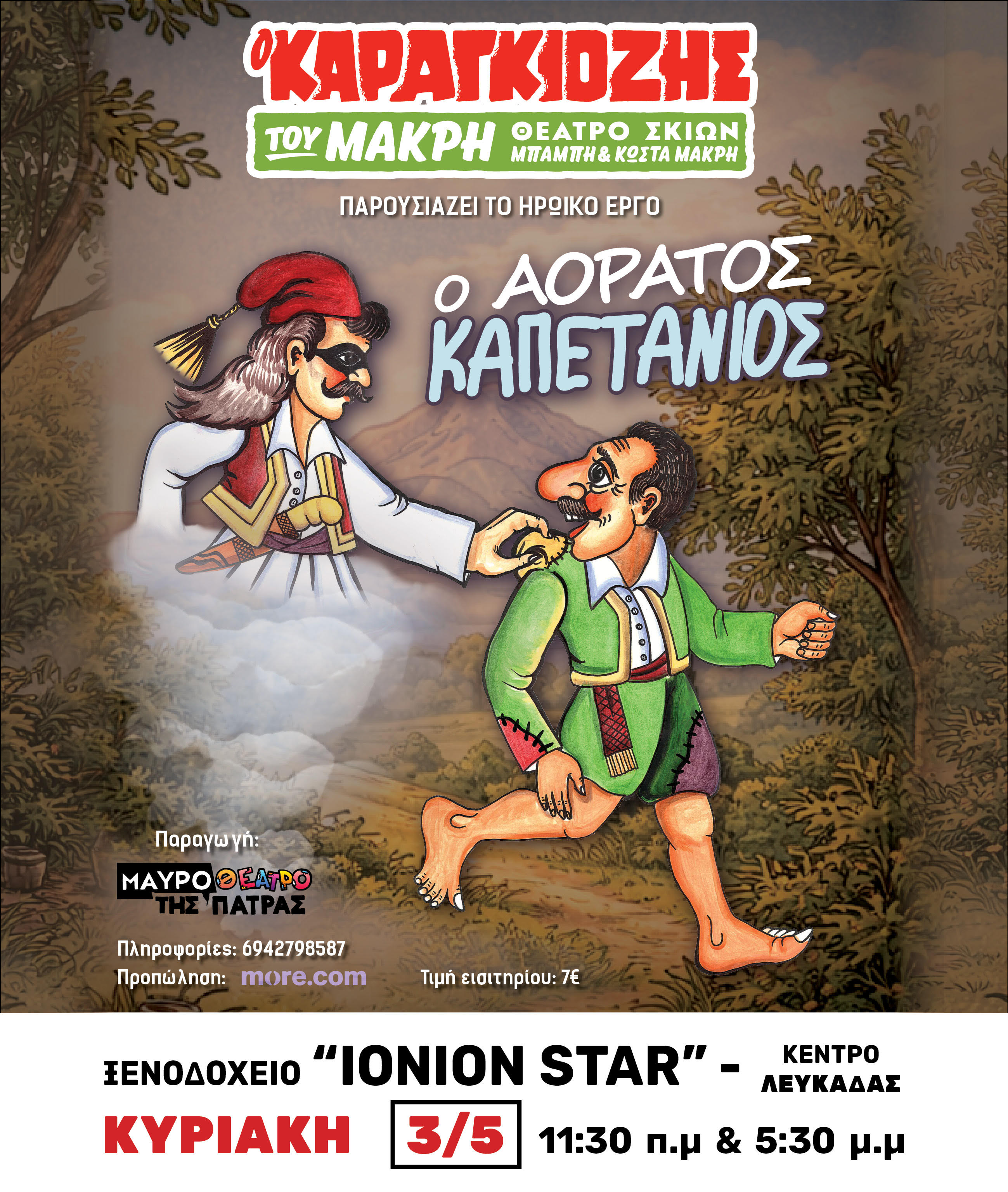 Ο Καραγκιόζης του Κώστα και Μπάμπη Μακρή παρουσιάζει την Κυριακή 3 Μαΐου 2026, στις 11:30 και 17:30, στο Ξενοδοχείο «ΙΟΝΙΟΝ STAR”, την παράσταση «Ο Αόρατος Καπετάνιος». Ένα ξεχωριστό έργο θεάτρου σκιών που θα ενθουσιάσει μικρούς και μεγάλους, συνδυάζοντας χιούμορ, αγωνία και ηρωισμό!
